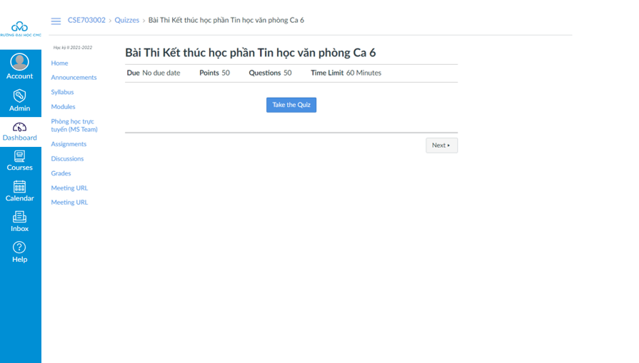 Sinh viên chọn vào “Làm bài kiểm tra” (Take the Quiz)